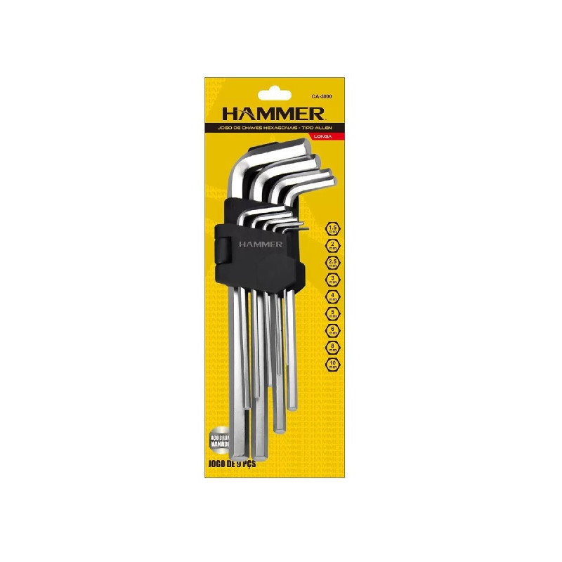 Produto: jogo de chave allen longa 1,5 a 10 mm com 9 peças marca: hammer descrição: o jogo de chave allen longa 1,5 a 10 mm com 9 peças da hammer, possui chaves ideais para o aperto e desaperto de porcas e parafusos as chaves são produzidas em aço cromo vanádio, compõe o jogo 9 peças, sendo: 1.5, 2, 2.5, 3, 4, 5, 6, 8 e 10mm. Especificações: material: aço cromo vanádio. Itens inclusos: chaves: 1.5, 2, 2.5, 3, 4, 5, 6, 8 e 10mm. Peso: 0.35 kg