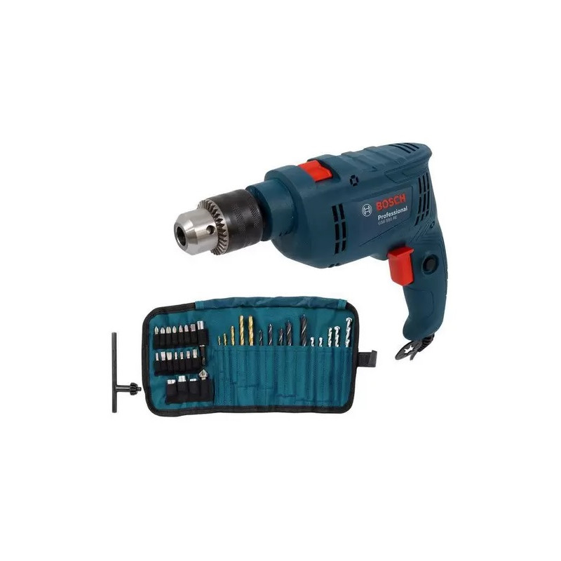 1 Furadeira de Impacto GSB 550 e 1 manual de instruções e chave de troca de mandril e 34 acc (13 Bits de 25mm PH2,PH3,PZ1,PZ2,PZ3,SL4,SL6,SL7T15T20,T25,T30) 01 Adaptador de Soquete 01 Escareador 01 Adaptador magnético 05 Brocas HSS para Metal (2, 2, 3, 4 e 5 mm) 05 Brocas para Concreto (5, 5.5, 6, 7 e 8 mm) 05 Brocas para madeira (4, 5, 6, 7, 8 mm)