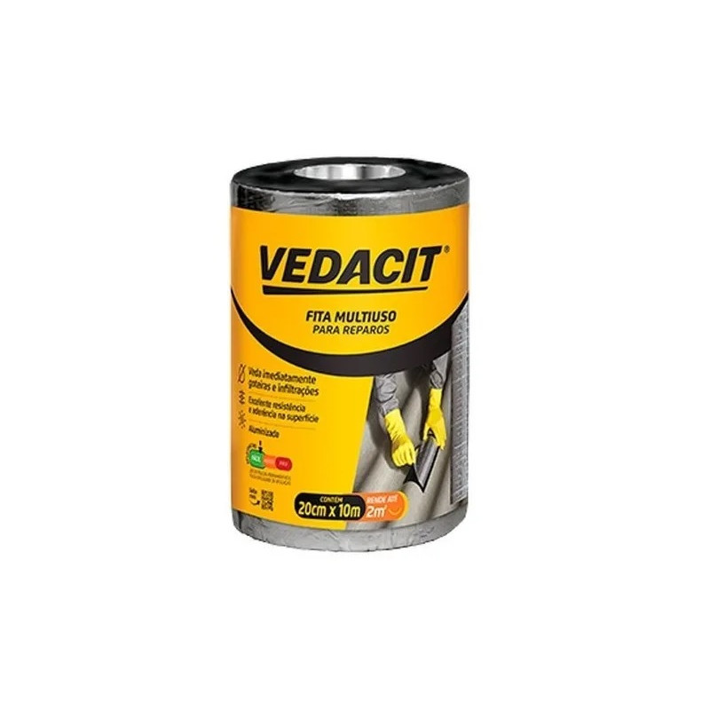 FITA MULTIUSO ALUMINIO 20CM METROA FITA MULTIUSO AUTOADESIVA VEDACIT é uma fita asfáltica impermeável, produzida à base de asfaltos modificados com polímeros e elastômeros, que apresenta excelente aderência a vários substratos. Possui estruturante não tecido resinado de poliéster que confere maior resistência e flexibilidade. A cobertura superficial de alumínio atua como barreira refletora dos raios solares e apresenta grande durabilidade. É de fácil aplicação, sendo um modo prático, rápido e eficaz de vedar imediatamente goteiras e infiltrações.
