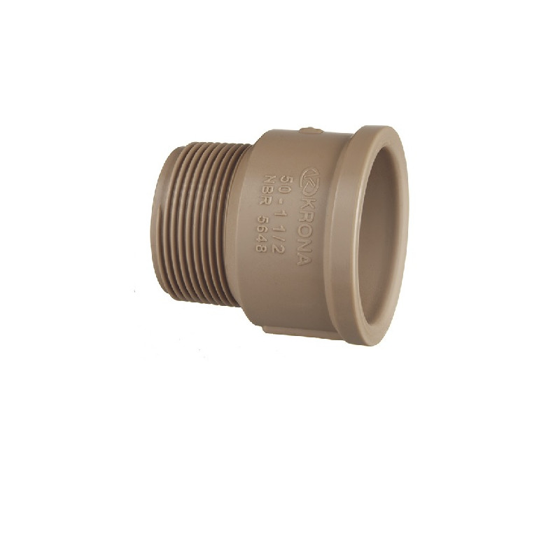 ADAPTADOR CURTO KRONA.1.1/2 (50MM)Todos os produtos desta seção são feitos em PVC, suportando a pressão 7,5Kgf/cmº², produzidos na cor marrom para a Linha Soldável e produzidos na cor azul para a Linha Soldável com Bucha de Latão, ambas seguindo a determinação das normas brasileiras.