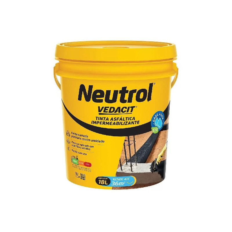 NEUTROL ACQUA VEDACIT OTTO 18LNEUTROL À BASE DE ÁGUA* é uma emulsão asfáltica de alta resistência química que forma uma película impermeável. É indicado para proteção de estruturas de concreto e alvenaria revestidas com argamassa em contato com o solo sujeita a águas e aos meios agressivos. Indicado também para estruturas de madeira e metálicas não expostas a intempéries. Por ter baixa emissão de COV, NEUTROL À BASE DE ÁGUA ajuda a reduzir a quantidade de contaminantes no ar, contribuindo para a preservação do meio ambiente.